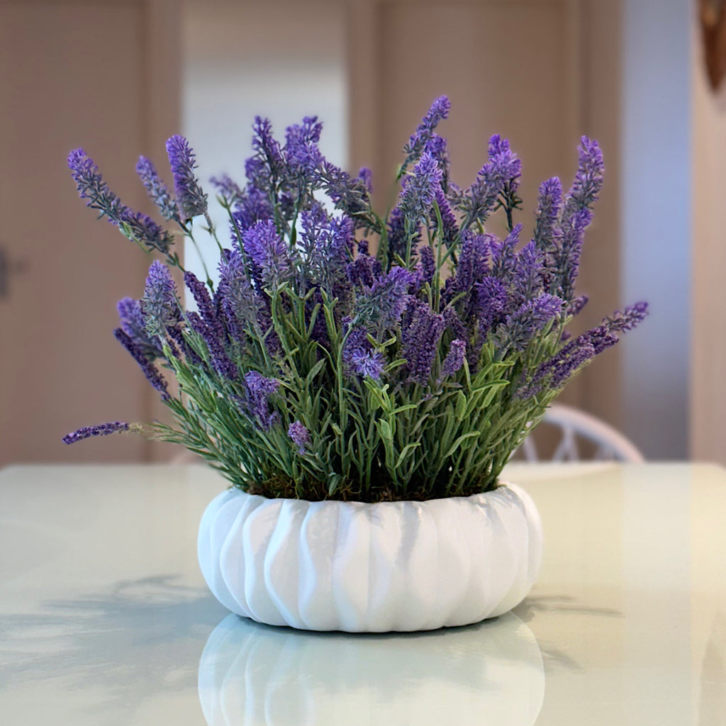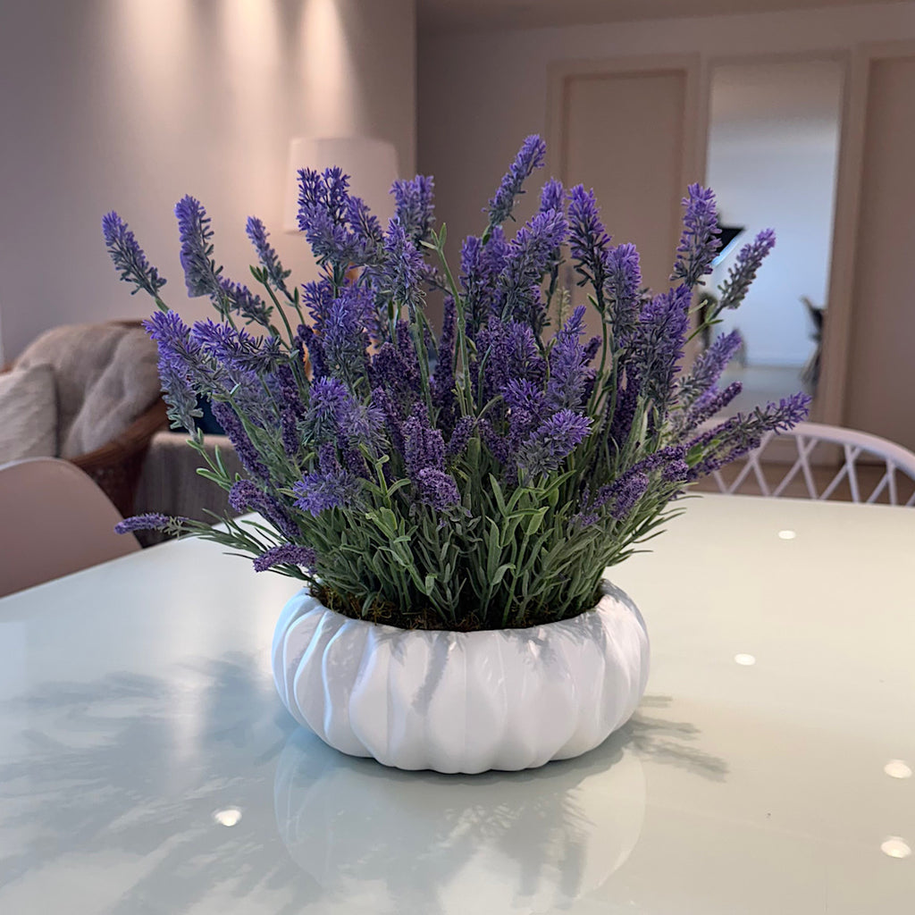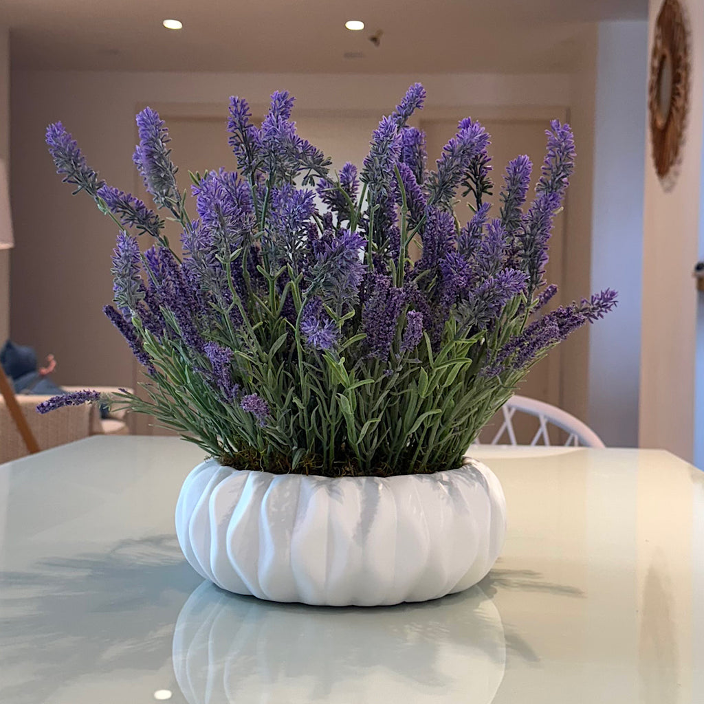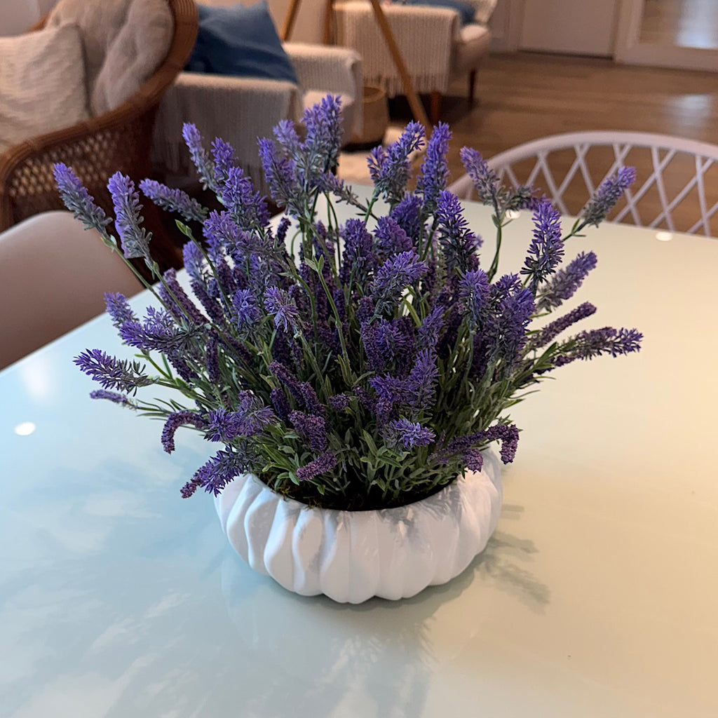 Arranjo pronto (montado) contendo, 1 vaso branco de cerâmica Branco ondulado, e muitos galhos de Lavandas, arranjo bem cheinho mesmo! Pode ser usado como Centro de Mesa de até 8 lugares!